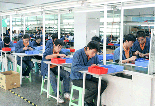 | 生产车间拥有三条流水作业线,作业员正在组装零件.